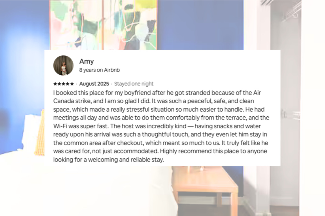 I booked this place for my boyfriend after he got stranded because of the Air Canada strike, and I am so glad I did. It was such a peaceful, safe, and clean space, which made a really stressful situation so much easier to handle. He had meetings all day and was able to do them comfortably from the terrace, and the Wi-Fi was super fast. The host was incredibly kind — having snacks and water ready upon his arrival was such a thoughtful touch, and they even let him stay in the common area after checkout, which meant so much to us. It truly felt like he was cared for, not just accommodated. Highly recommend this place to anyone looking for a welcoming and reliable stay.