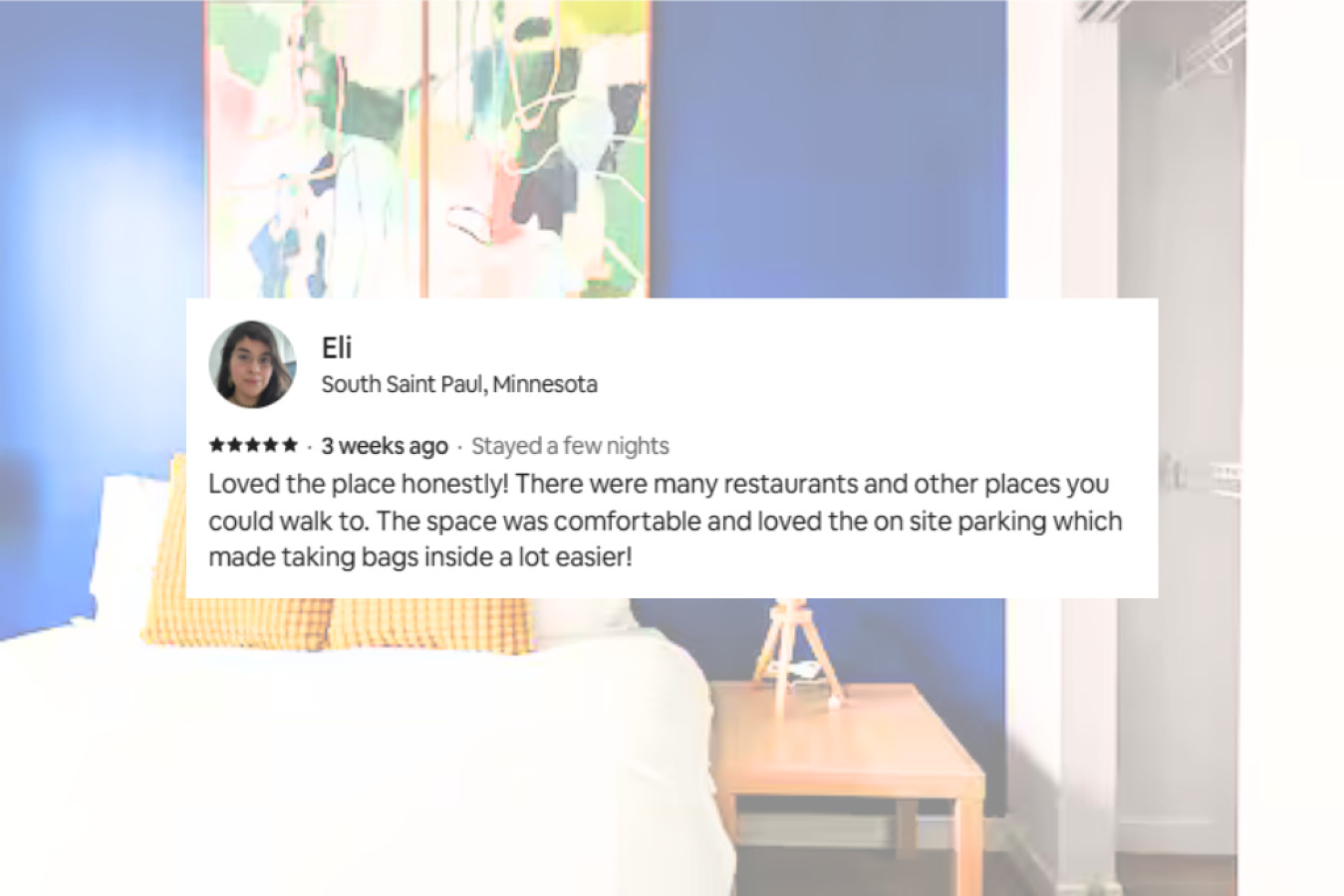 Loved the place honestly! There were many restaurants and other places you could walk to. The space was comfortable and loved the on site parking which made taking bags inside a lot easier!